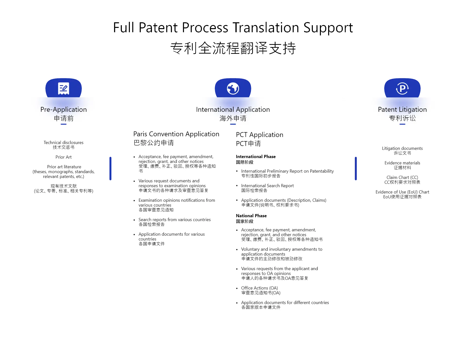 當涉及到多語言專利翻譯時,服務商需要不僅了解最前沿的創新技術、符合專利翻譯規範,還需具備對多語言資源管理和質量控制的能力。在這個複合型要求下,好博譯以其卓越能力滿足客戶需求。通過多年的多語言專利翻譯實踐,我們不僅集結了遍布全球的知識産權母語專家網絡,更構建了完善的資源管理、項目管理、質量控制和工具支持體系。這種全方位的專利多語言管理能力确保翻譯的準确性和專業性,爲客戶的全球專利布局帶來了可靠的保障,爲您的創新保駕護航。